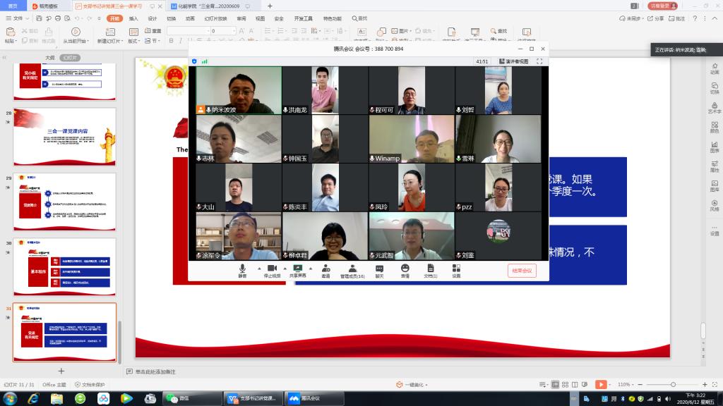 化学工程系教工党支部齐聚线上会议室,党支部书记傅小波带领支部党员重温了“三会一课”制度内容,以《认真做好疫情防控常态化下“三会一课”》为题讲授党课。