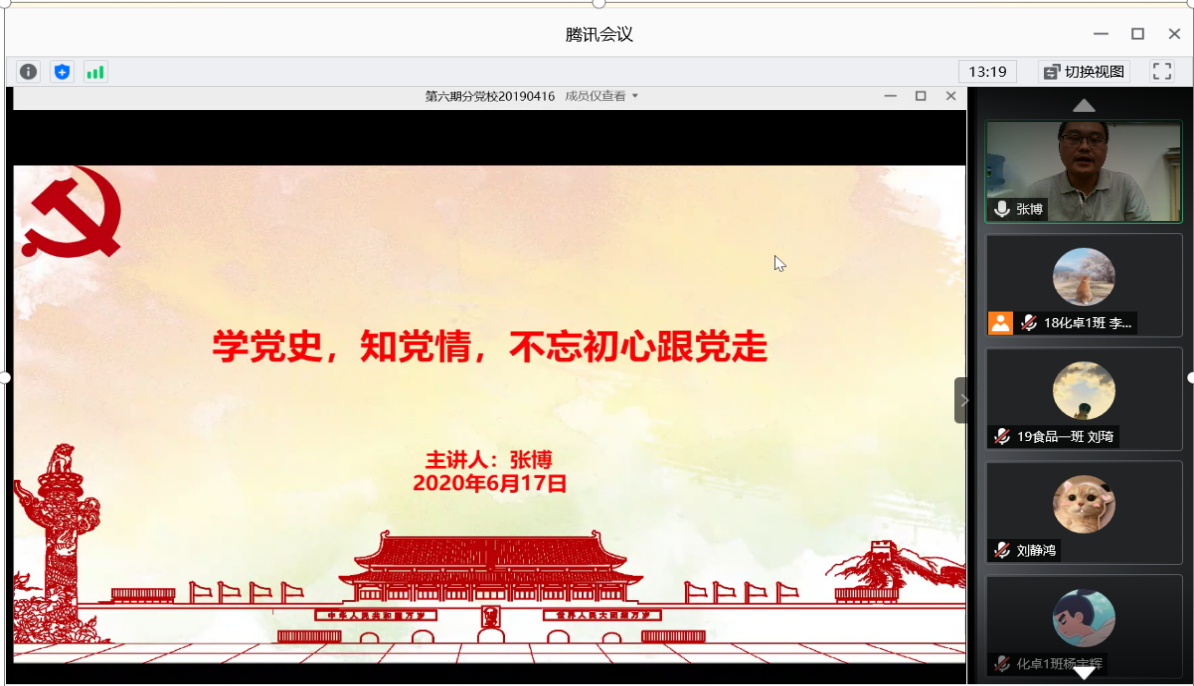 2020年6月17日,anime1 应化与食品学生支部书记张博通过腾讯会议形式为支部党员和入党积极分子讲授“学党史,知党情,不忘初心跟党走”主题党课。