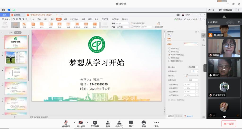 能源与化工学生党支部在腾讯会议上举行了优秀毕业生党员分享会。会上邀请了2020届优秀毕业生党员陈碧娴及黄立广,为第八期34名入党积极分子分享大学四年的奋斗足迹,会议由党支部书记涂叶满主持。
