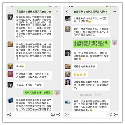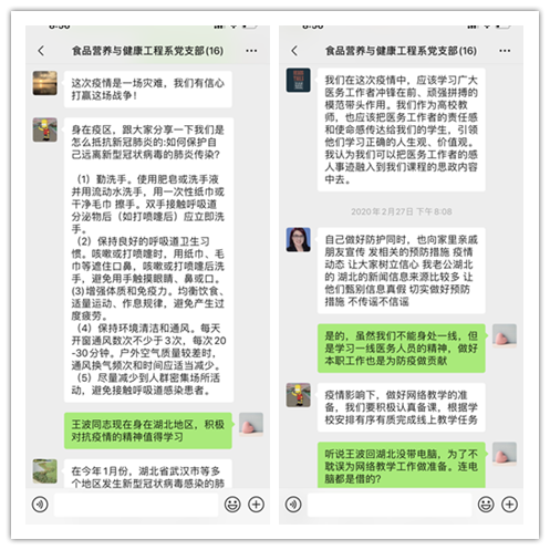 食品营养与健康工程系教师支部于2020年2月27日晚上8:00通过微信的形式开展了“发挥党员先锋作用,合心助力疫情防控”线上主题党日活动,活动由支部书记刘晓珍主持,全体党员同志参加了本次活动。