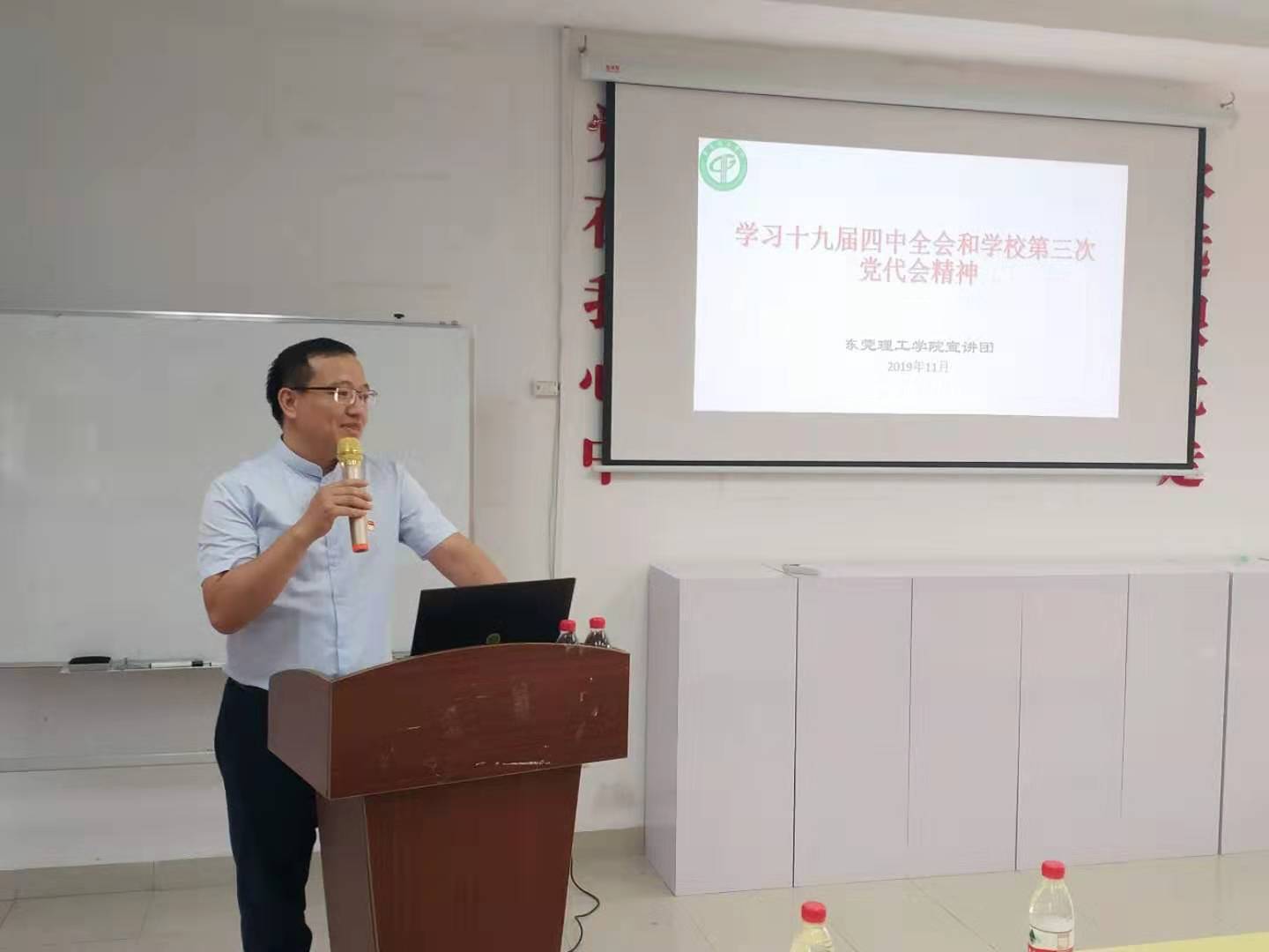 会议由学院党委书记夏勇主持,邀请了校长特聘人才,发展规划处副研究员,学校第三次党代会报告起草核心成员胡文龙博士作专题宣讲,此次会议的主题是:《学习十九届四中全会和学校第三次党代会精神》