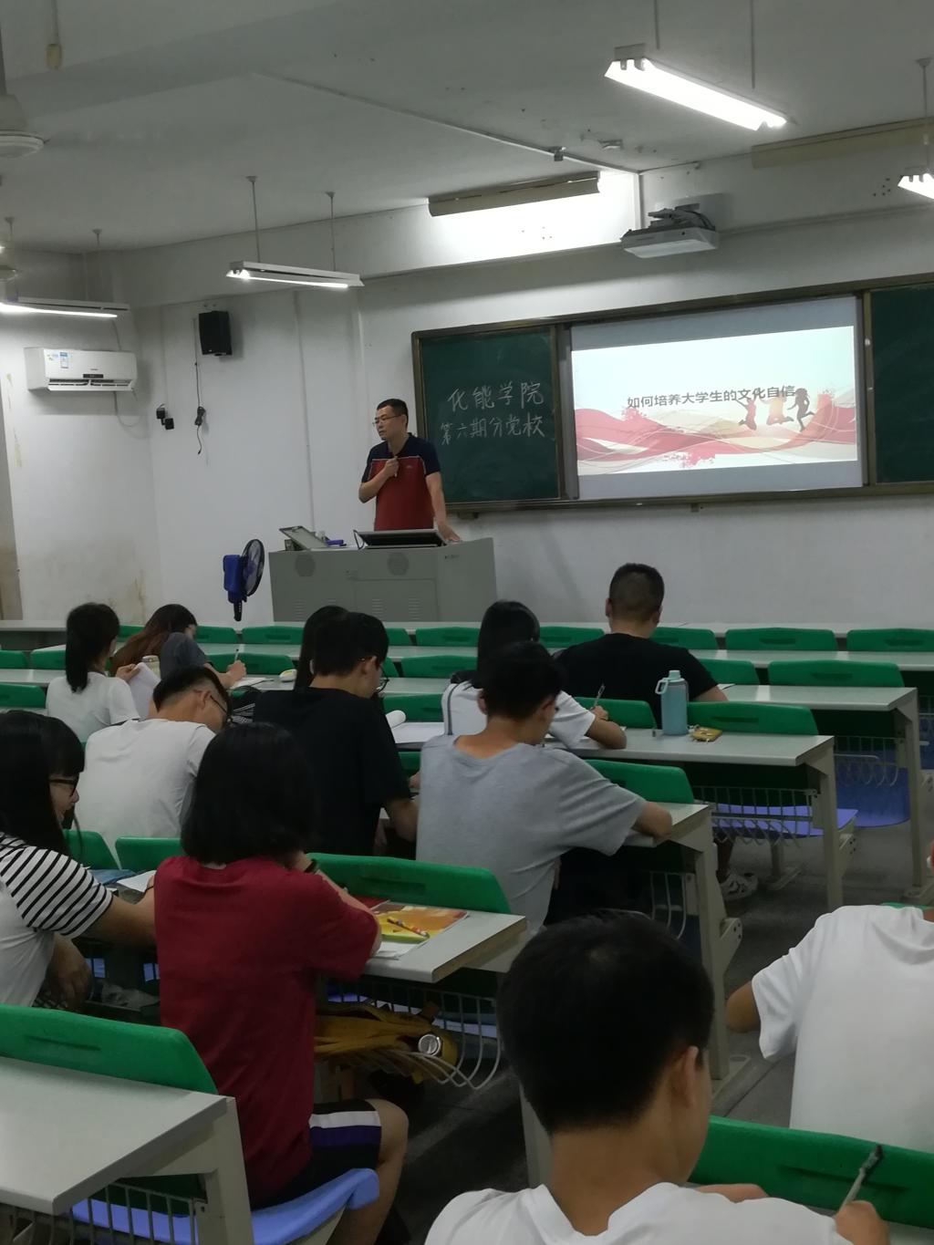 大学生文化自信的现状,并将其与入党积极分子的生活联系起来,通过图片展示和文字说明对新形势下如何培养大学生的文化自信提出了独到的见解。课上,入党积极分子们认真听讲,课堂学习氛围十分浓厚。