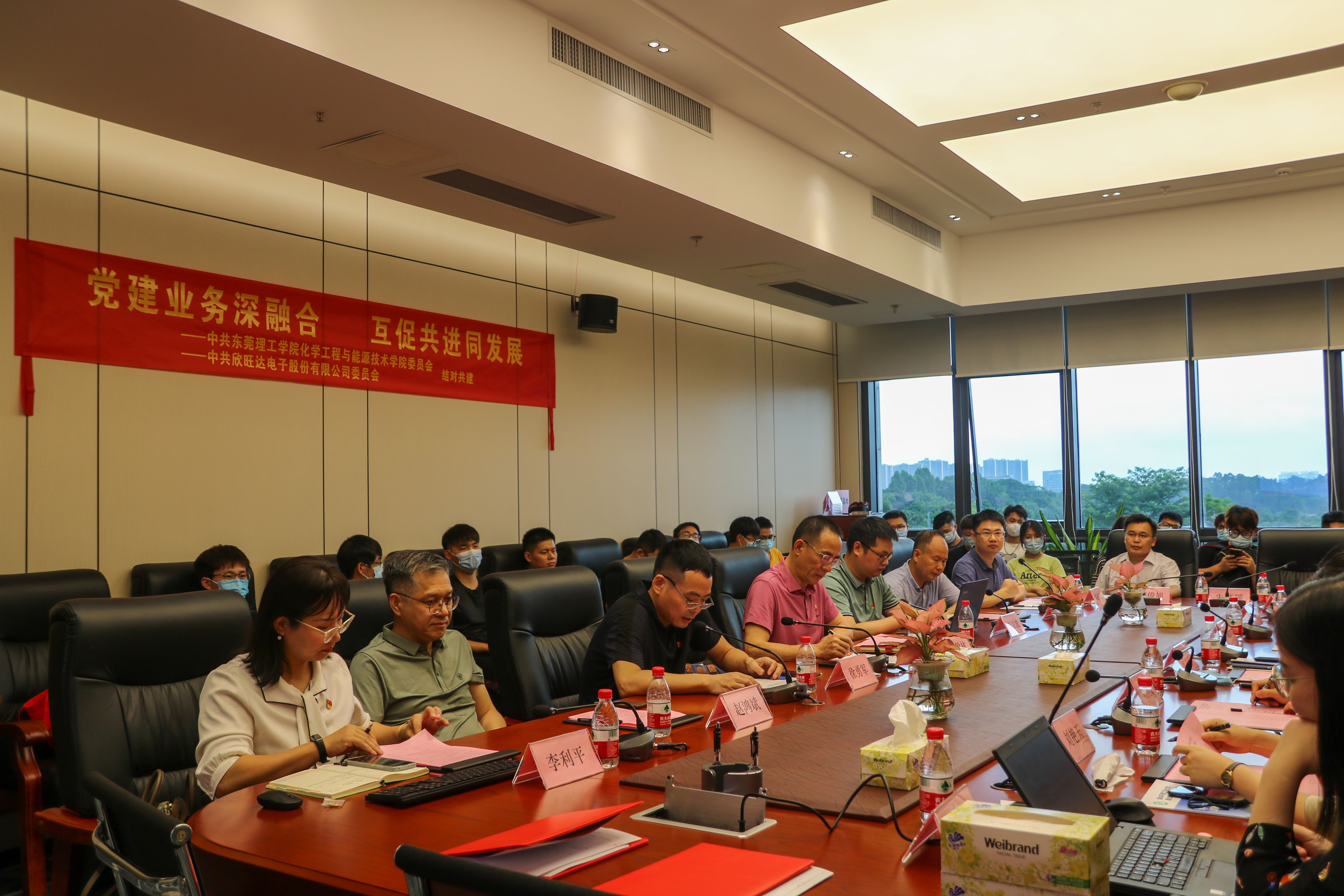 教授老师、教师党员代表、学生代表,欣旺达电子股份有限公司党委书记、总裁助理、欣旺达大学执行校长尹庆玲、欣旺达惠州动力新能源有限公司制造副总经理刘桂松以及欣旺达电子股份有限公司党建专员等参加本次结对共建活动。