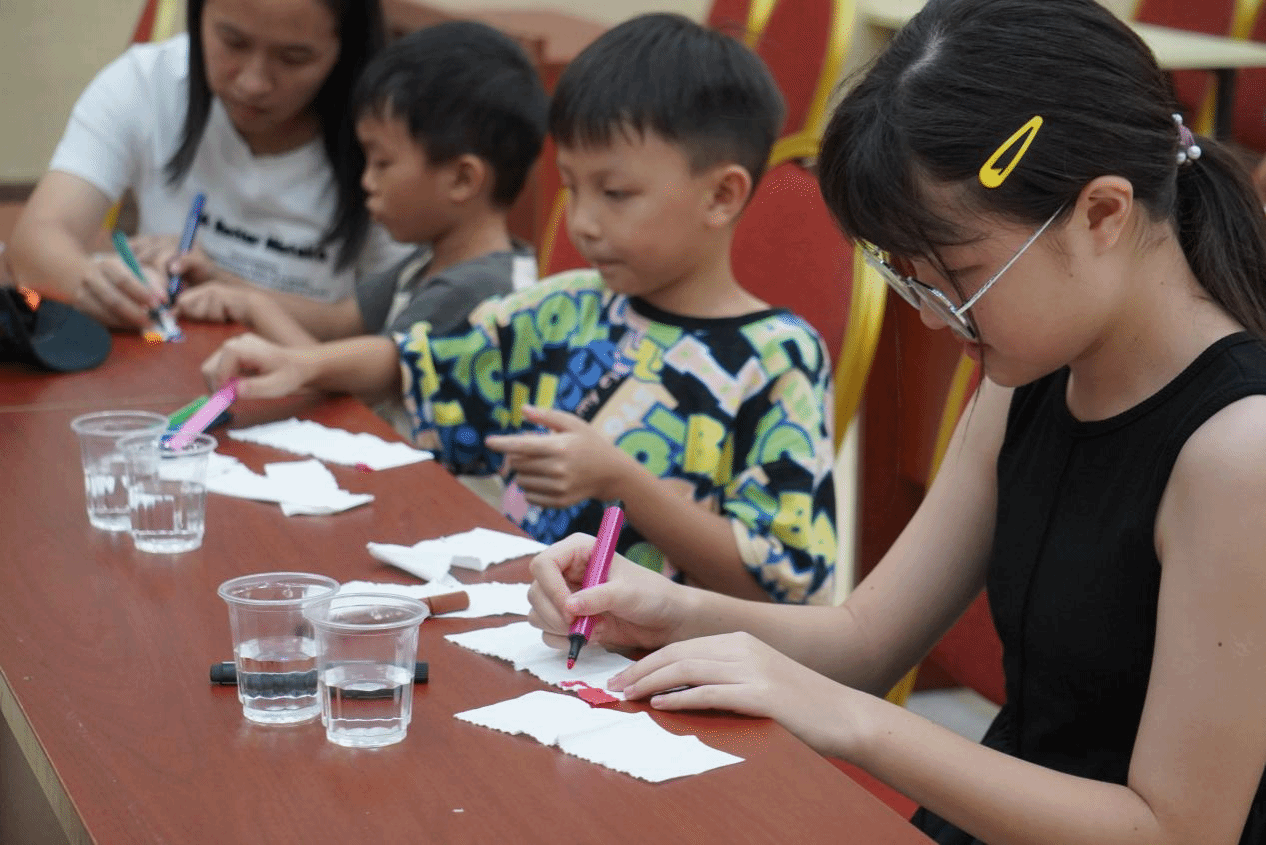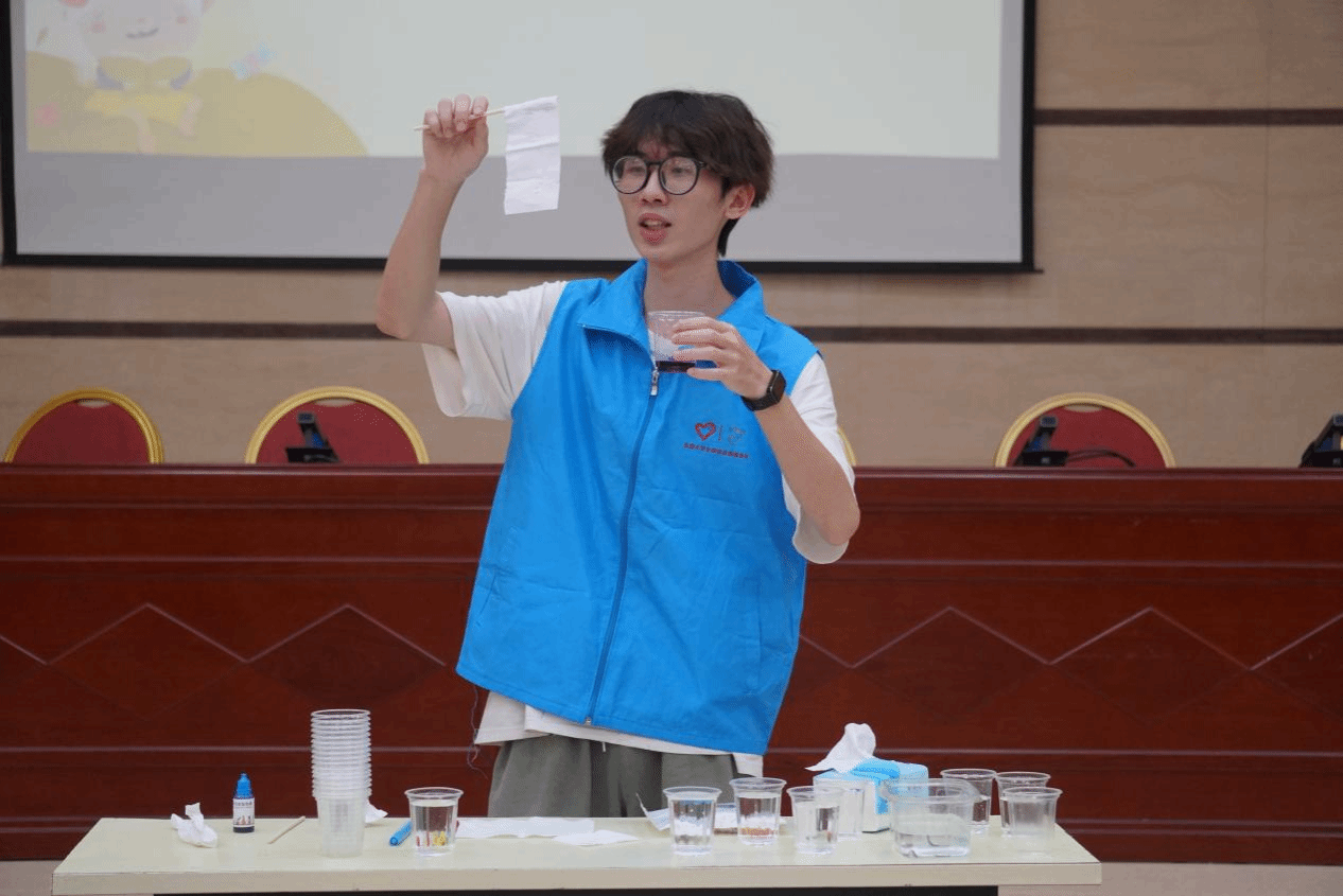 下午3点,小朋友们和家长陆陆续续来到科普活动现场。活动伊始,志愿者许今乐通过一个简单的纸巾吸水小实验向小朋友们解释了“毛细现象”。随后,在志愿者们的指导下小朋友们动手完成了“会爬的彩虹”实验。小朋友们在纸巾上涂绘了自己喜欢的颜色,利用两杯水和刚刚学到的“毛细现象”知识在纸巾上制作出了属于自己的“彩虹”。