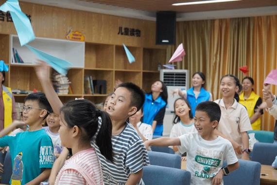在“纸飞机放飞梦想”环节,志愿者们引导孩子们将写有职业理想的卡纸折成纸飞机。一名女孩怯生生地问:“我可以当女科学家吗?”志愿者林坤鹏用居里夫人的故事鼓励她:“科学没有性别,你的坚持就是答案。”当五彩纸飞机盘旋升空,孩子们追逐欢呼的身影与墙上“梦想起飞”的标语交相辉映,成为社区最美的风景。