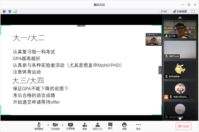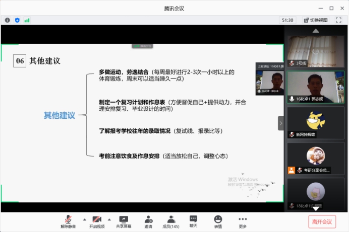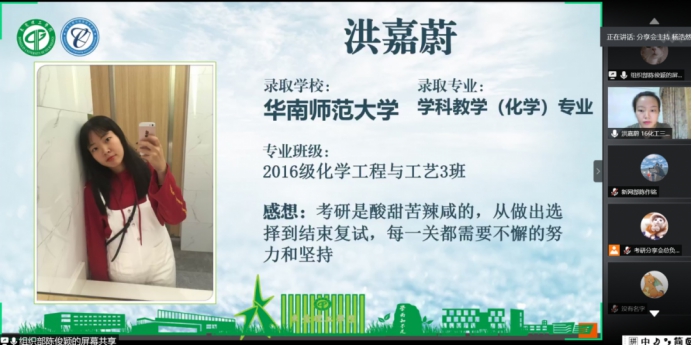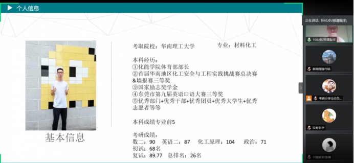 将以线上的形式在腾讯会议举行2020年考研经验分享会,请到了今年考研成功的优秀学长学姐们为同学们进行关于考研的事项的讲解,分析考研形式,同时解答同学们的一些考研上的疑惑。本次分享会分为上午和晚上两场,共邀请了2016级化学工程与工艺3班洪嘉蔚、2016应用化学(卓越计划)1班郭志成等11位成功考研的学长学姐进行分享。anime1