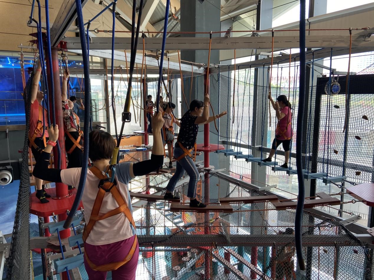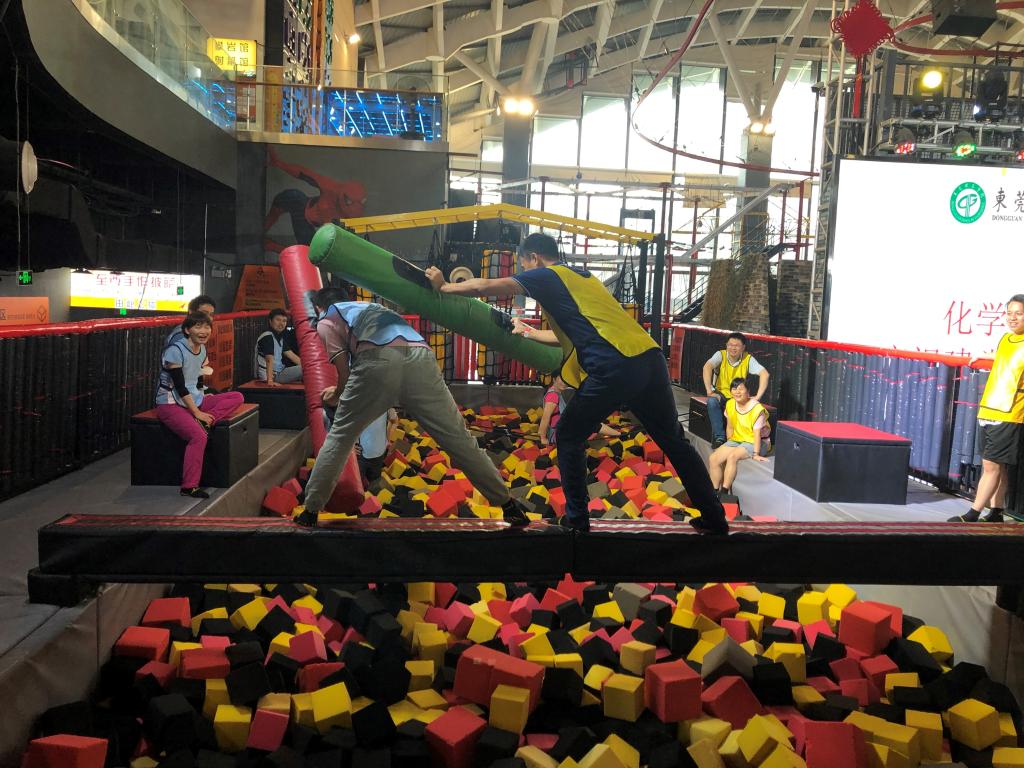 教职工分为两队,各队着不同颜色的队服,凝聚力迅速凸显,在短时间内团结协作,设计队名及口号,在舞台前面姿态昂扬展现了各队团队精神风采;随后,在教练的指导下进行了同心协力、勇攀高峰、海绵对战三个项目的团建对抗活动,每位教职工都积极参与,集思广益,相互合作,充满激情,运用集体的智慧共同完成了所有项目;在对抗环节结束以后,老师们自由体验了场馆内包括雪橇滑梯、高空攀爬架、信念之跃、大峡谷滑梯、飞狐塔、漂移车场等在内的30余项目,老师们仿佛回到的少年时期,玩的不亦乐乎。