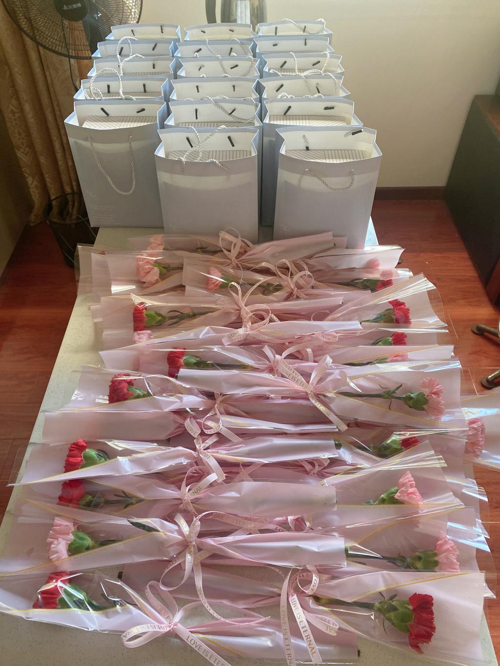 女教工代表,并赠送了鲜花和环保饭盒,表达节日的问候与祝福。女教工们欣喜又感动,满脸洋溢着灿烂的笑容。