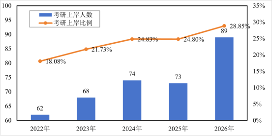 2026届毕业生共305人,其中106人报名参加全国硕士研究生招生考试,101人初试成绩达到国家A类线,过线率高达95.3%,最终境内录取85人,按过线人数计算录取率达84.2%;另有4人被境外高校录取,整体升学人数达89人,刷新学院历史纪录。
