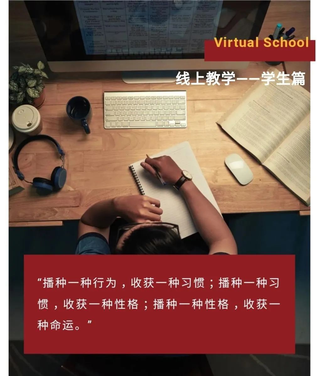 虽然我们知道在线远程教学并非是最理想的状态,但是学校的全体教职工一直都在为学生能够在这段期间内得到最佳的教学而持续努力着。请各位在继续做好自我防护的同时,尽快投入到学习状态中,3月2日准时与老师们网络“见面”!线上学习其实并不陌生,但这场疫情带来的居家办公学习的隔离,使我们长时间独自面对电子产品及各种诱惑并不比学习知识本身简单。