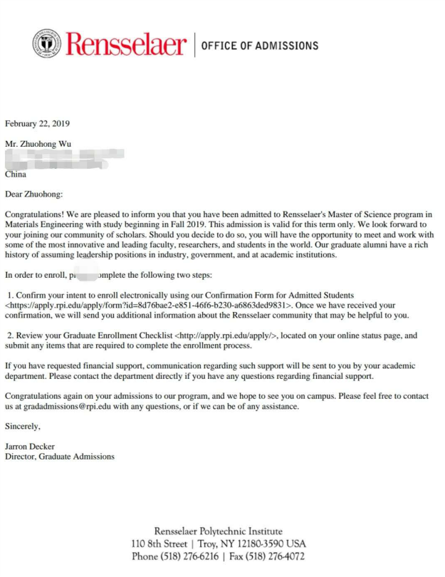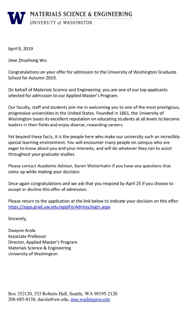 2015级应用化学专业吴卓洪同学被美国华盛顿大学,以及美国伦斯勒理工大学硕士研究生项目(thesis-oriented)录取,录取项目分别为材料科学与工程(Materials Science and Engineering)和材料工程(Materials Engineering)。根据美国权威的美国新闻与世界报道(U.S. NEWS)大学综合排名,近年来,华盛顿大学排名世界第10名;伦斯勒理工大学美国大学排名第42名。